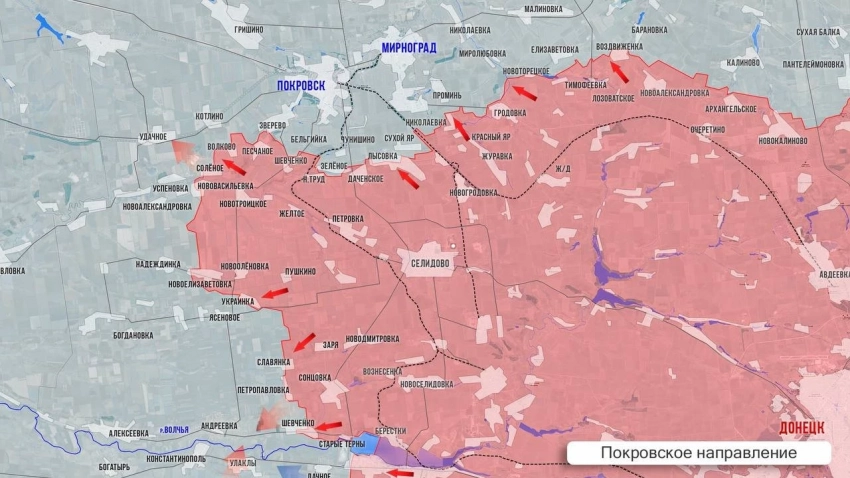 На восточном фланге Покровского направления Барановка практически перешла под контроль наших войск. Наши атакуют в направлении Тарасовки. Из-под Покровска приходят новости о том, что ВСУ отступили из Зелёного, а российские группы зачистили карман между Даченским и местным Шевченко, продолжая при этом продавливать оборону ВСУ в Чинушино. На западном отрезке этого участка наши подразделения взяли под контроль участок дороги Межевая-Покровск и вышли на подступы к Котлино, до которого осталось одно поле. Не стихает накал сражения за карьер на северо-западе от Солёного. Здесь ВС РФ решают оперативную задачу по выходу к Удачному, с северной шахты которого просматривается дорога на Павлоград. Южнее ВС РФ дожимают противника в Ясеневом, а от него до Шевченко атакуют к Андреевке.