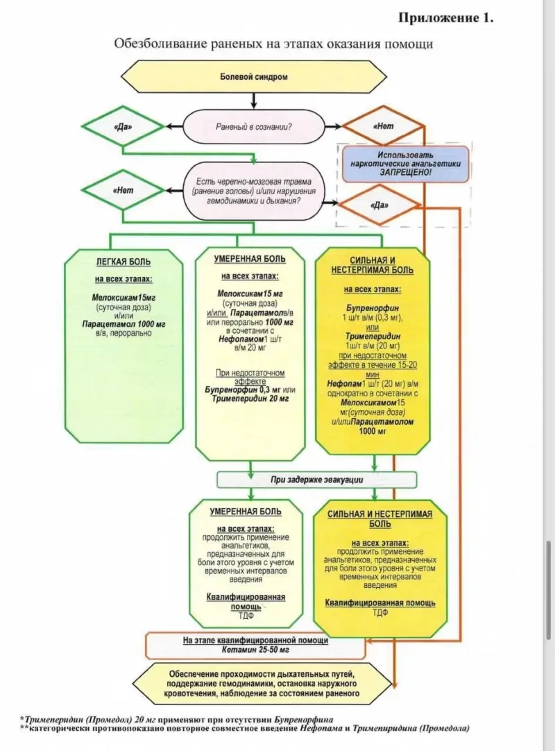 В июне 2024 года опубликовано пособие для ВС РФ: «Временные Указания По Применению Анальгетиков» — май 2024 (Рис. 1). Пособие создано под влиянием алгоритма аналгезии из современной версии ТССС (Tactical Сombat Сasualty Сare) (Рис. 2).