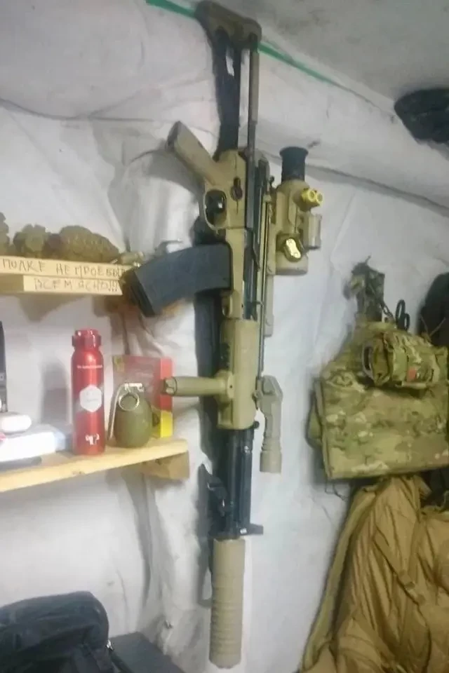 А-545 бойца спецназа в ПВД в зоне СВО. По словам самого «оператора», планку Пикатинни для установки сошек и рукоятки пришлось крепить к цевью на саморезы, штатная в этом месте отсутствует, коммерческого цевья для этой системы просто не существует.