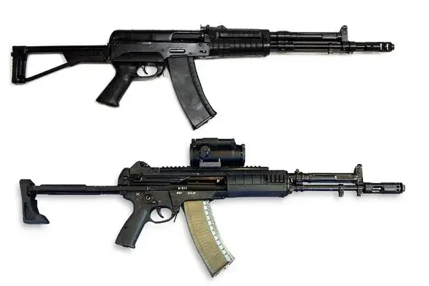 Автомат, представленный на конкурс по ОКР «Ратник», внешне очень сильно отличался от своего прародителя. Инженерами-оружейниками была проделана огромная работа по улучшению эргономики и эксплуатационных характеристик оружия. На фото вверху АЕК-971, внизу А-545.