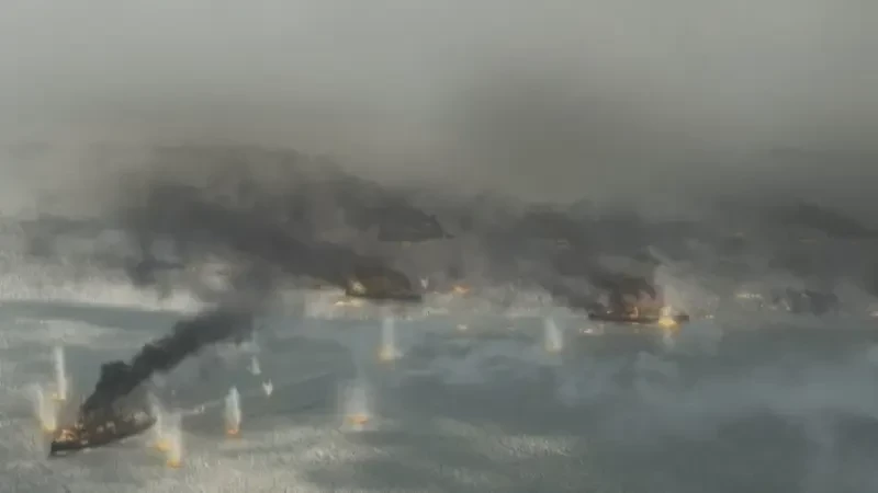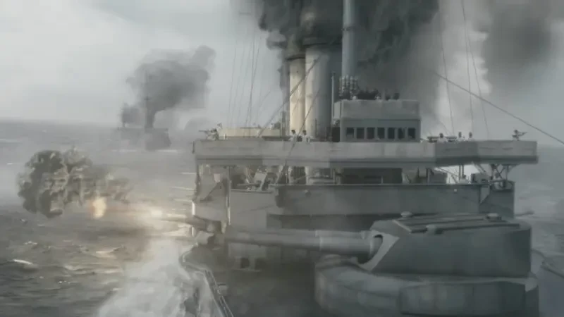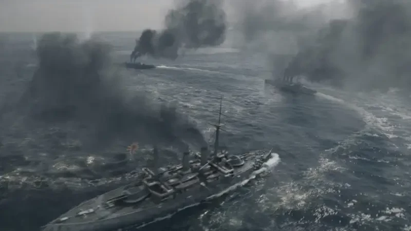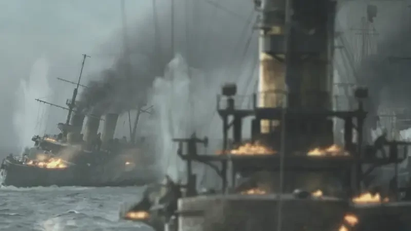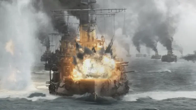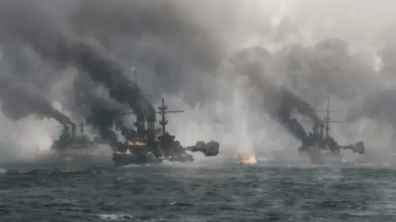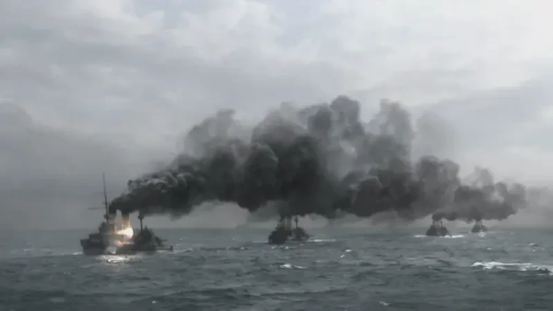 Петля Того в исполнении японских броненосцев. Кадр из фильма «Тучи над холмами»
