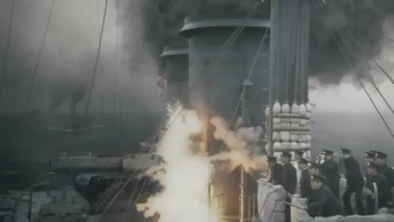Броненосец «Микаса» ведёт огонь. Кадр из фильма «Тучи над холмами»