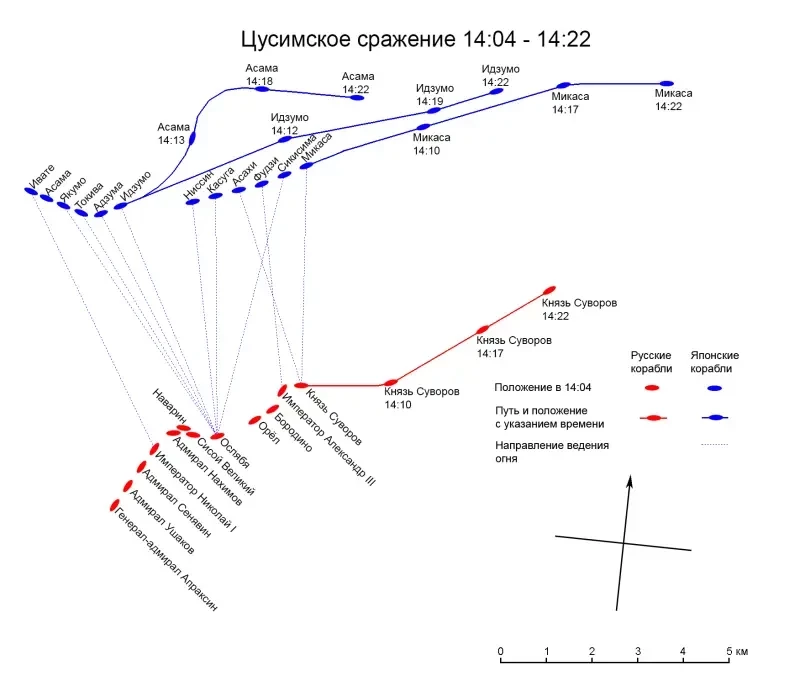 Схема маневрирования в Цусимском сражении 14:04-14:22