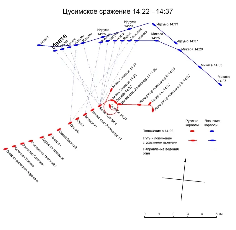 Схема маневрирования в Цусимском сражении 14:22-14:37