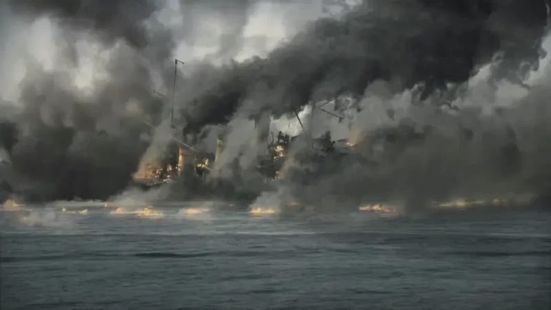 Попадание в броненосец «Князь Суворов». Кадр из фильма «Тучи над холмами»