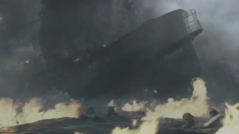 Броненосец «Ослябя» тонет. Кадр из фильма «Тучи над холмами»