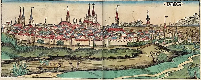 Любек был основан в 1143 году, а уже во второй половине XII века торговля с Готландом дала городу импульс, и благодаря своему удачному географическому положению он быстро стал торговым городом, а впоследствии и «королевой Ганзейского союза». Здесь материалы и товары с севера и востока обменивались на товары с запада и юга. Около 1200 года порт стал главным пунктом отправления для немецких колонистов, отправлявшихся на балтийские территории, завоеванные Ливонским орденом, а позднее Тевтонским орденом. А в 1226 году император Фридрих II повысил город до статуса имперского свободного города, благодаря чему он стал Вольным городом Любек. Источник: иллюстрированная хроника библейской истории от сотворения мира «Нюрнбергская хроника» (Liber Chronicarum).