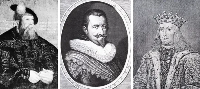 Непримиримые враги Ганзейского союза, слева направо: шведский король Густав I, датский король Христиан IV и датский король Иоганн, положивший конец ганзейской торговле на Востоке.