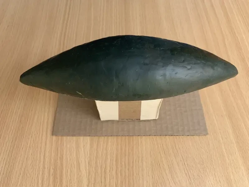 После того как палуба, наклеенная на упаковочный картон, была вырезана, на нее был наклеен профиль корпуса, также на картонном основании. Получился Т-образный профиль корпуса, к которому, а именно к палубе, была приклеена картонная «ручка» из нескольких склеенных между собой кусочков картона и такое же картонное основание. Все пространство между палубой и профилем корпуса было заполнено пластилином так, чтобы получился ровный седловатый корпус египетской ладьи.