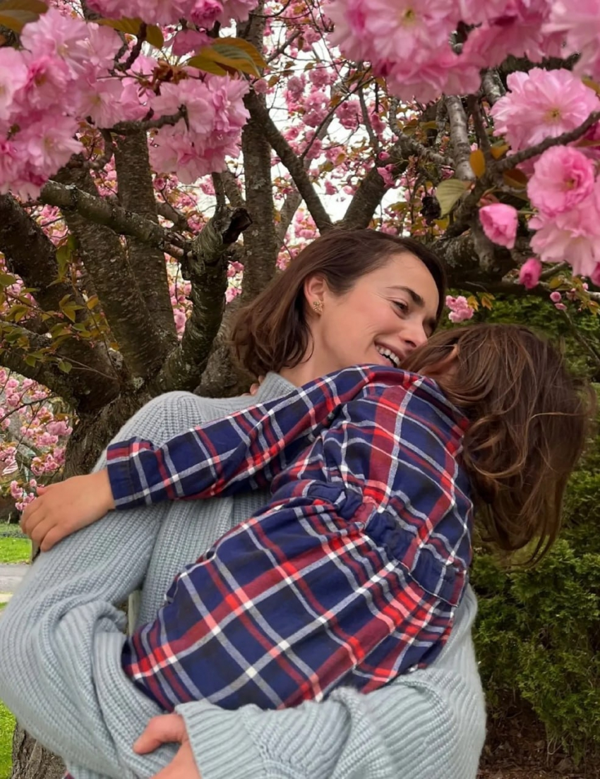 Актриса уделяет много времени общению со своей дочерью, проводит с ней время на прогулках в парке. В одной из таких фотографий она изображена в стильном образе, а ее дочь одета в яркое платье в клетку. На снимке выглядит артистка счастливой, держа свою дочь на руках.