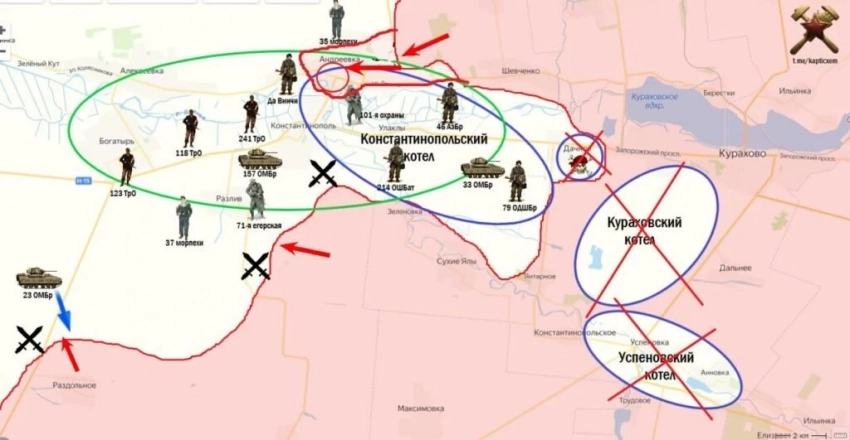 На Константинопольском (Кураховском) направлении все идет к ликвидации образовавшегося "мешка". Противник практически выбит из Андреевки, где сохраняет свое присутствие только на крайних улицах с запада. Кроме того, мы давим на Улаклы и Константинополь с восточной и южной стороны.