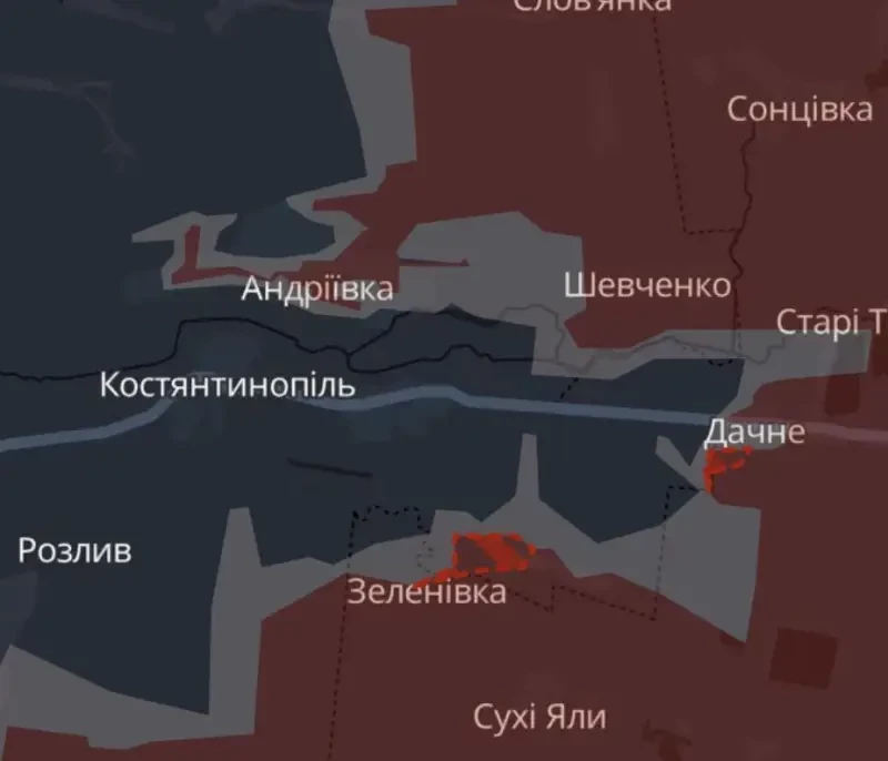 Российские войска близки к тому, чтобы разрезать группировку ВСУ, оказавшуюся в полуокружении в так называемом Андреевском мешке западнее Курахово. Об этом сообщает аффилированный с ГУР МО киевского режима ресурс DS. Публикуя карты продвижения ВС РФ на этом участке ЛБС, киевские аналитики подчеркивают, что российские части вбили мощный клин в оборону ВСУ в районе населенных пунктов Дачное и Зеленовка.