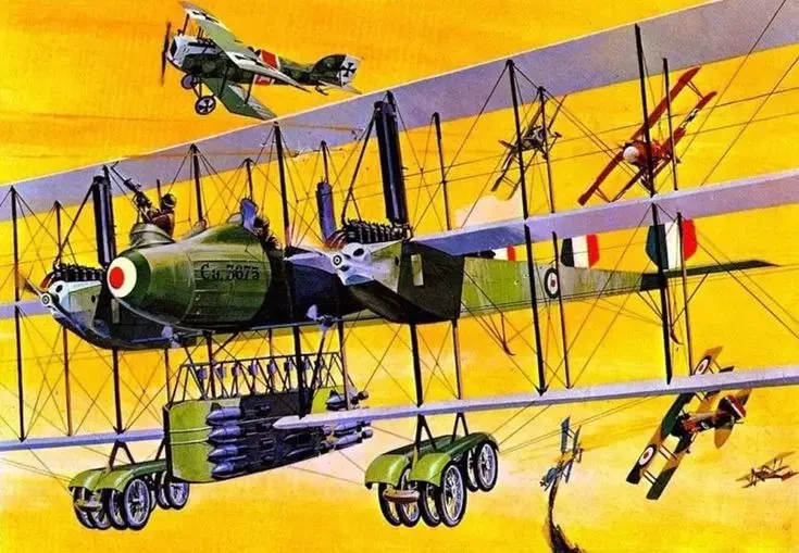 Капрони был человеком с фантазией, поэтому его самолёт впечатлял оригинальной схемой! Это был двухфюзеляжный триплан с тремя двигателями: один с толкающим пропеллером располагался в центральной гондоле, а два — с тянущими винтами в боковых фюзеляжах. Несмотря на столь оригинальную конструкцию, самолёт был весьма не плох. Он успешно бомбил цели в Австро-Венгрии в 1918 году, выпускался в варианте торпедоносца (правда, сведений об успешном применении в этом качестве я не нашёл), и вообще — стал лучшим бомбардировщиком стран Антанты! Нести 1950 кг бомб — и во Вторую Мировую войну не плохо, а уж для 1918-го года...