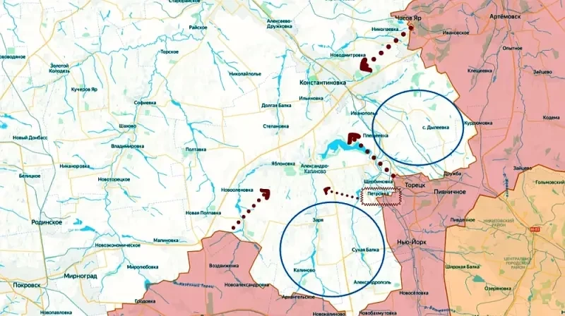 Второй полукотел для ВСУ вырисовывается северо-западнее Дзержинска. Здесь наши войска двумя клиньями идут от Часова Яра и Дзержинска на Константиновку, которая является одним из важнейших логистических и оборонительных центров ВСУ в ДНР. О возобновлении активности ВС РФ в районе Клещеевки и Андреевки под Часовым Яром начали уже рефлексировать украинские медиа.