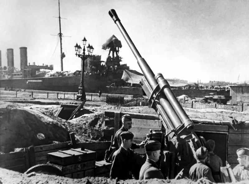 Советская 85-мм зенитная пушка 52-К образца 1939 года на набережной в Ленинграде.