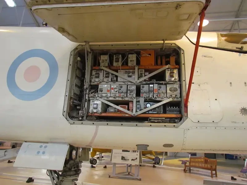 Большой отсек авионики, расположенный сразу за кабинами экипажа, с открытой створкой люка для удобства доступа.