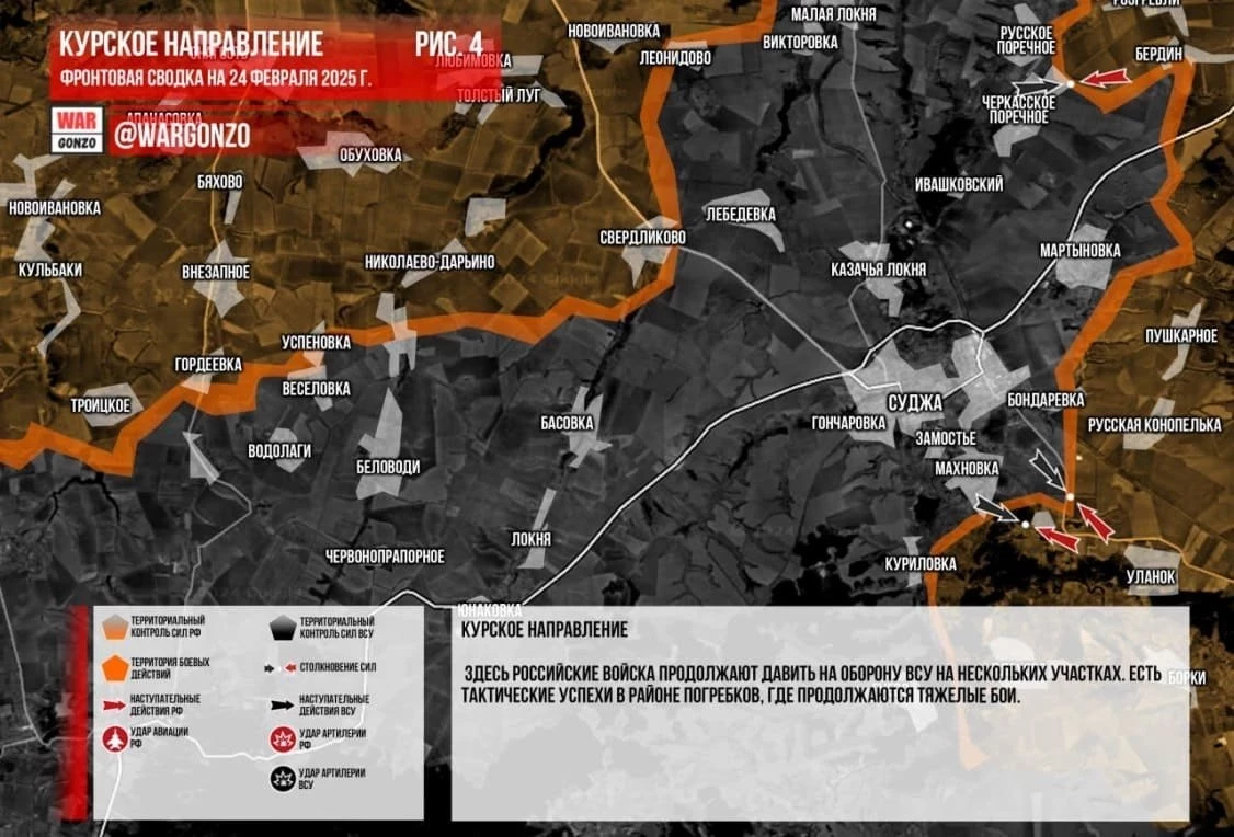 Из Курской области поступают данные об успехе ВС России вблизи Погребков в н.п. Марьевка (освобождение подтверждает ГрВ «Север»). На направлении продолжаются встречные бои, наши войска работают тяжёлыми огнемётными системами. Сообщают о боях в Лебедевке: российские подразделения продвигаются вперед, противник задействовал подразделения своих десантно-штурмовых бригад, сил специальных операций и пограничников. Группировка войск «Север» пишет, наша морская пехота завершает зачистку Куриловки, выбивая остатки оккупантов с южных окраин населенного пункта. Продолжается уничтожение оккупантов в Никольском, продвинувшись в самом населенном пункте и его окрестностях.