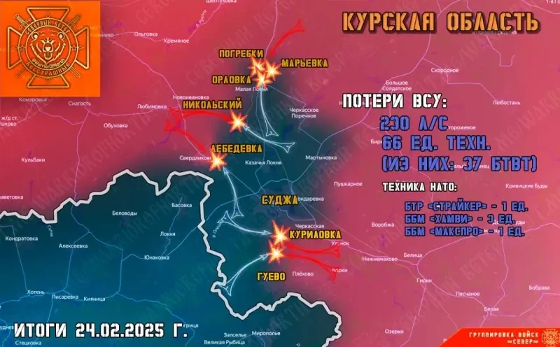 По боевым действиям: основные бои идут в районе Погребков, где подразделения группировки «Север» продолжают перемалывать украинскую «элиту» из состава десантно-штурмовых бригад ВСУ. Там же есть наше продвижение в районе Марьевки, идет зачистка прилегающих лесополос от противника. Несколько опорников наши взяли в районах Орловки и Новой Сорочины, а также в окрестных лесах. Ликвидация северного плацдарма ВСУ продолжается, «Бесстрашные» продвигаются к Судже.