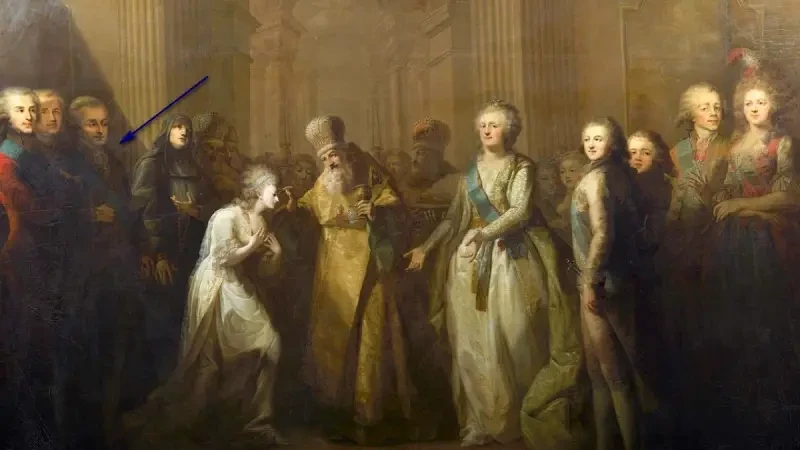 А. Безбородко на картине Е. Машкова «Миропомазание великой княгини Елизаветы Алексеевны» (указан стрелкой)