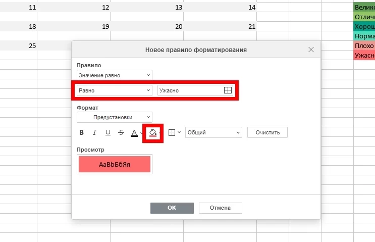 - Введите первое значение из списка (например, «Ужасно») и выберите соответствующую заливку (например, красную).