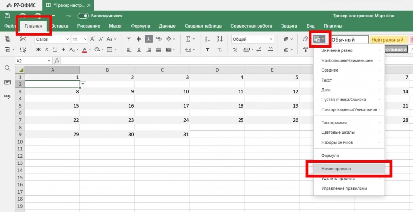 - Перейдите в «Главная» → «Условное форматирование» → «Новое правило».