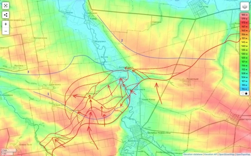 На БольшеНовосёлковском направлении за прошедшие двое суток наши части сумев полностью ранее занять Бурлацкое и Привольное, пытаются закончить выдавливание противника южнее главной линии обороны на этом участке (у меня обозначена цифрой «3»).