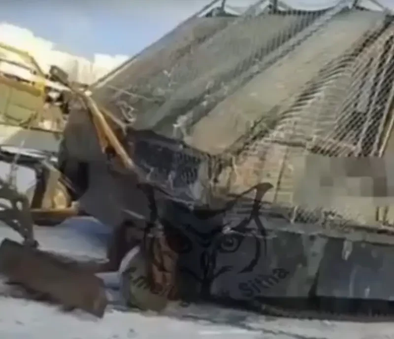На кадрах запечатлена, предположительно, легендарная «Мотолыга», на которую установлены противоминный трал, дополнительные листы металла, а также противодроновые ловушки в виде сетей и цепей.