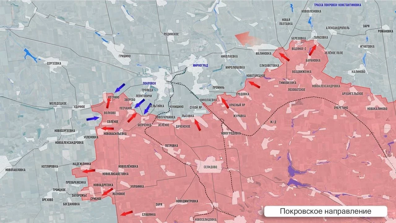 Позитивная новость пришла с левого фланга Покровского фронта - ВС РФ восстановили контроль над Шевченко, выбив противника из северо-восточной части посёлка. В Удачном и Котлино продолжаются встречные бои без особых изменений на земле. На правом фланге очень тяжёлые бои в Елизаветовке, где противник имеет очень сильные рубежи. Враг наступает в районе Малиновской развязки, по данным с мест, смогли несколько потеснить наших. В Тарасовке у ВС РФ есть тактические успехи. Встречные бои в районе Водяного Второго и Берёзовки, там противник активно контратакует.