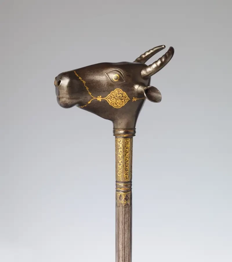 А это «настоящая» булава с навершием в форме головы быка из Ирана. Она ассоциируется с героями «Шахнаме» поэта Фирдоуси о доисламском Иране, завершенного в 1010 году н. э. Булава воспроизводит оружие героя Бахрама Гура, сделанное в память о корове, которая его вскормила. Являясь символом силы и добра, она была унаследована другими героями эпоса, в частности Феридуном и Рустамом. На ней стоит ложная подпись легендарного кузнеца Хаджи Аббаса и столь же ложная дата 951 г. хиджры (1544–1545 гг. н. э.). Вес 879 г. Метрополитен-музей, Нью-Йорк.