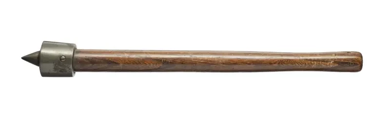 Англия или Франция. Чугунная головка в форме слегка сужающегося приземистого цилиндра с верхним шипом. Деревянная рукоять, слегка сужающаяся к концу для удобства удержания в руке. С отверстиями на обоих концах рукояти для шнура. Королевский арсенал, Лидс.