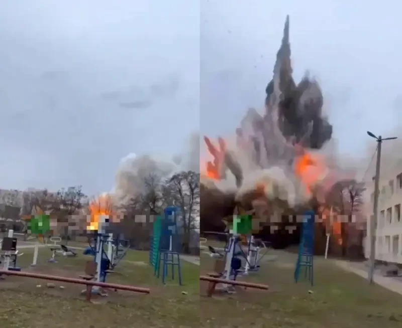 Кадры удара ВС РФ, предположительно, ракетного, публикуют сразу несколько очевидцев. На одном из видео показан мощный взрыв, даже два, вблизи с детской площадкой и, скорее всего, каким-то административным зданием, у которого вылетели все окна в результате воздействия взрывной волны.