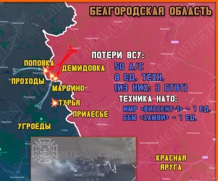 Также в районе посёлка Проходы Сумской области, в километре от границы нашим дроном-камикадзе уничтожен украинский танк Т-72. В течение дня десант ВСУ пытался прорваться при поддержки бронетехники в направлении Поповки, и все эти атаки наши части отразили, две БМП ВСУ уничтожены FPV - дронами.