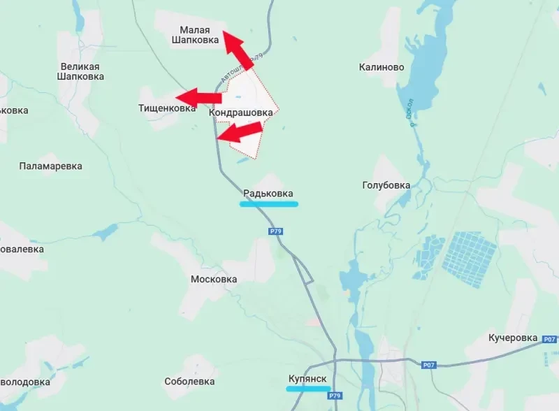 Также штурмовые подразделения ВС РФ заняли большую часть села Тищенковка. Оно располагается по другую сторону дороги Р79 от упомянутой Кондрашовки. Дорога Р79 идёт от Купянска к освобождённой от войск киевского режима Двуречной и далее – к границе Белгородской области.