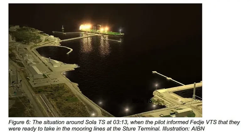 В 03:13 лоцман сообщил Центру, что танкер начал выбирать швартовы и готов отойти от причала. В этот момент мимо терминала проходило судно направлением на юг, а в северной части зоны было еще два судна, двигавшиеся в северном направлении, и одно в южном.