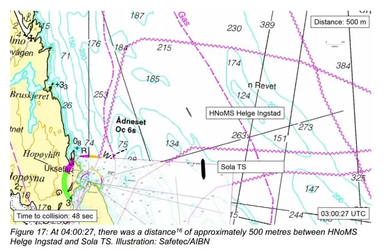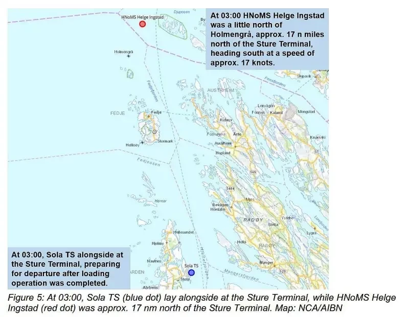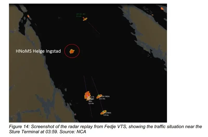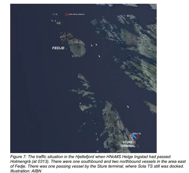 Оператор центра спустя некоторое время после запроса лоцмана с танкера вспомнил, что примерно в полтретьего военный корабль извещал центр о входе в его зону действия. Он немедленно связался с лоцманом по УКВ и в 03:59:46 сообщил тому, что, по всей вероятности, приближающееся судно — военный корабль Helge Ingstad.