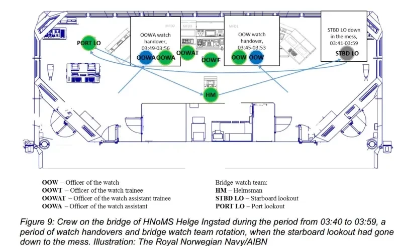 На мостике находилось 7 человек. Вахтенный офицер (OOW), как и положено, за всё отвечал и всё контролировал, а кроме него, было еще три офицера: дублер вахтенного офицера (OOWT), помощник вахтенного офицера (OOWA), дублер помощника (OOWAT). Трое рядовых моряков выполняли функции впередсмотрящих и рулевого, периодически подменяя друг друга. Дублеры офицеров занимались определением положения судна, используя электронные карты (ECDIS) и оптические средства. Местного лоцмана на фрегате не было.