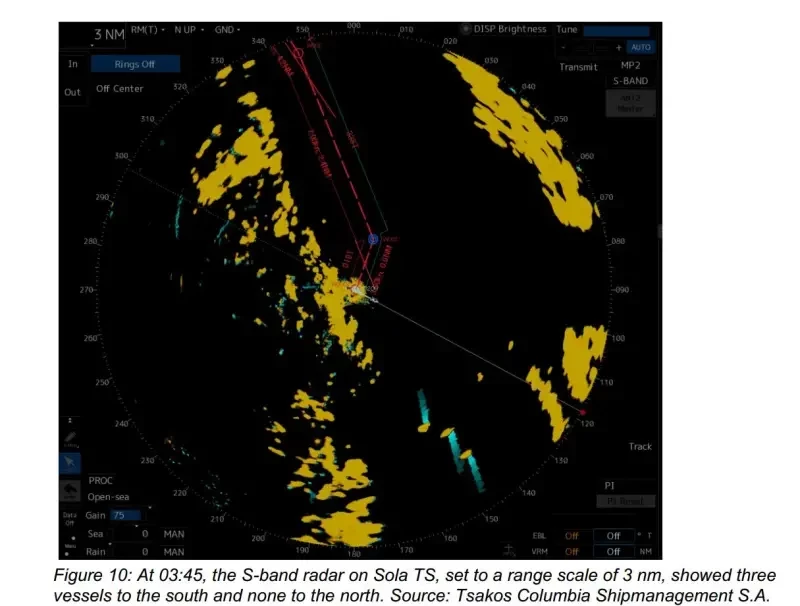 Сменявшийся офицер сообщил, что «объект» передает сигнал AIS, но не показывает скорость и вектор курса, то есть он неподвижен. По этой причине радар корабля не показывал «трек» этого объекта. Показания обоих OOW несколько отличаются. Сменявшийся офицер, видя два сигнала AIS, нажал на один из них и прочитал «Sola TS», в то время как вновь прибывший офицер, видя отметку синего цвета, посчитал это за стационарный объект, не принадлежавший ни одному из судов.