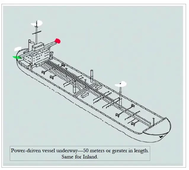 (Прим.: попробуйте мысленно развернуть рисунок, и вы поймете, что если два белых топовых огня — один ниже другого — находятся на одной линии друг над другом, и при этом видны одновременно зеленый и красный бортовой огонь, то это значит, что встречное судно движется точно тебе в лоб.)