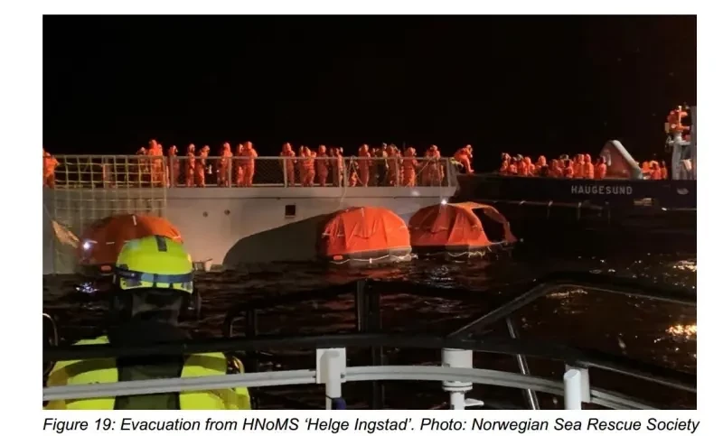 Буксир ‘Velox’ сообщил, что он может забрать всех, и что экипаж фрегата может перейти к нему на борт с вертолетной палубы. Эвакуация прошла без происшествия, и к 05:28 почти весь экипаж покинул корабль. Остались десять человек на мостике фрегата, пять человек дежурили на катере Sjøbjørn.