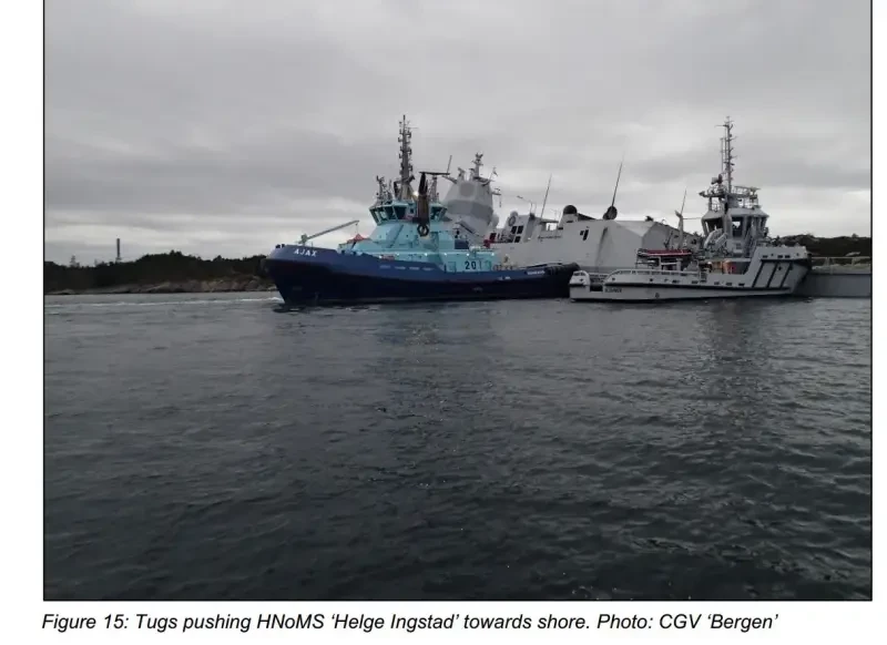 В 04:08 фрегат сообщил Центру, что они столкнулись с неизвестным объектом, потеряли ход и нуждаются в срочной помощи буксиров. Центр передал это сообщение буксиру «Аякс», который поспешил на помощь, основываясь на предполагаемой позиции фрегата, полученной по AIS. На самом деле фрегат находился несколько западнее, был не освещен и плохо различим на фоне высокого берега. Дистанция до суши была уже 0,3 мили.