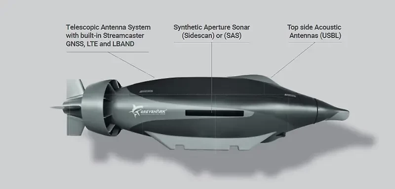 Первые результаты своей деятельности две компании представили в ноябре прошлого года на выставке Euronaval 2024 в Париже. На своём стенде Euroatlas продемонстрировала полноразмерный макет АНПА под названием Greyshark и ряд рекламных материалов, посвящённых новому проекту. Разработчики рассказали об основных особенностях аппарата и назвали расчётные характеристики.