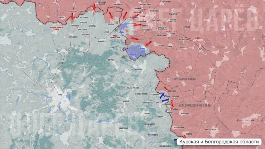 В Гуево накануне шло сражение за южные окраины, большая часть села и все ключевые точки уже под контролем наших сил. Также наши наступают на высоты перед хутором Горналь. Сообщают, что ВСУ отступают к Свято-Никольскому монастырю.