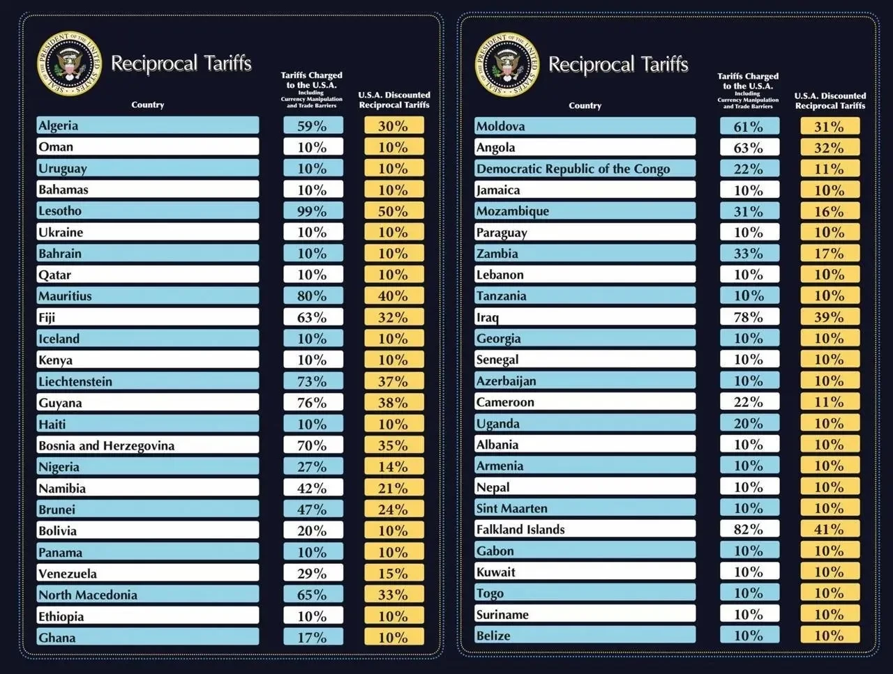 Первая колонка с цифрами, которые, как считают в администрации Трампа, соответствуют пошлинам иностранных государств в отношении США. Следующая колонка - те пошлины, которые в ответ вводят США - они составляют от 50 до 100% от иностранных пошлин (в интерпретации Трампа).