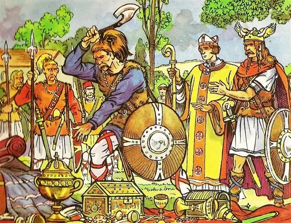 На этом изображении Святой Ремигий, епископ Реймса, приходит просить Хлодвига, который в то время ещё не принял христианство, о возвращении священной чаши, которая хранилась в соборе в Суассонском королевстве, захваченной франками при разграблении ими Суассона. Винтажная иллюстрация. Рисунок по мотивам средневековой миниатюры. Источник: Digital Vision Vectors.