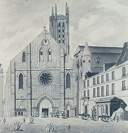 Базилика была построена в 508 году на горе Лукотиций, там, где находился форум римского города Лютеция. В 511 году в ней похоронили короля франков Хлодвига I. После смерти мужа его жена, королева Клотильда, завершила постройку храма, возведя портики и украсив вход в главный зал. Эта базилика стала первым королевским некрополем в Париже. Была разрушена вторгшимися норманнами в IX веке. Зарисовка церкви аббатства Святой Женевьевы, сделанная в XVIII веке. Автор: Nicolas Ransonnette (1745-1810). Источник: Bibliotheque nationale de France