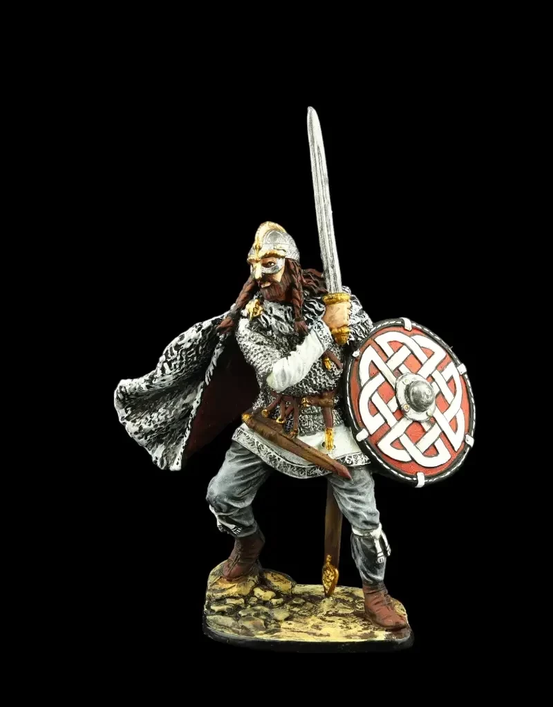 Возможно, что именно так выглядел легендарный Рюрик, ставший в землях славян основателем династии Рюриковичей. На вид типичный викинг, норманн. Одет в кольчугу, а в руках у него топор – излюбленное оружие «северных людей» и шлем с полумаской, склепанный из четырех сегментов. Производители: Silver Dream Studio и «Серебряная Ладья».