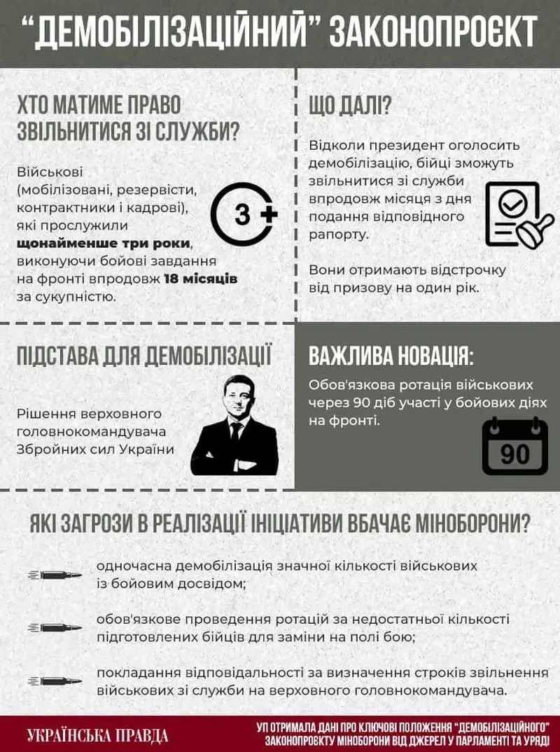 Согласно ранее озвученной информации, новый законопроект, который готовили совместно Верховная Рада и Минобороны Украины, предусматривал демобилизацию 108 тысяч военнослужащих ВСУ, из них 14 тысяч — офицеры. Решением для демобилизации должно было выступить распоряжение Зеленского, после которого всех увольняли в три дня.