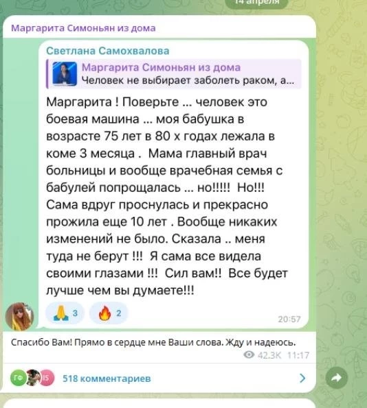 А что же на самом деле сказала Маргарита Симоньян? 14 апреля она опубликовала пост со словами благодарности одной из подписчиц, которая поделилась с ней замечательной и вдохновляющей историей из жизни собственной семьи. Женщина рассказала, что некогда в тяжёлом состоянии оказалась её бабушка. Дети-медики уже мысленно прощались с пожилой женщиной, как вдруг она сама неожиданно встала с больничной кровати и прожила ещё 10 лет.