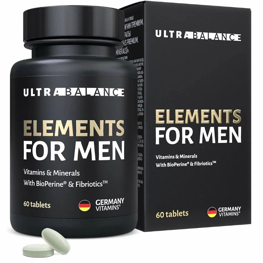 Elements for Men Premium от UltraBalance — это топ бад для суставов и не только: мощная формула для мужского организма работает по всем фронтам. Здесь и BioPerine, ускоряющий усвоение витаминов, и Fibriotics — пребиотик с ферментированной смесью из 36 овощей и фруктов, который влияет на микробиом, метаболизм и иммунитет. Комплекс помогает восстановиться после нагрузок, улучшает мозговую активность, борется с утомляемостью и даже тормозит выпадение волос. Всё продумано, вплоть до оболочки без диоксида титана.