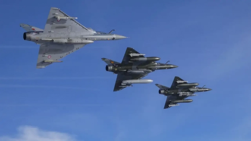Два Mirage 2000D RMV летят в строю с Mirage 2000-5. Ведущий самолет оснащен двумя MICA IR AAM, двумя GBU-49, 30-мм пушечным контейнером CC422 и контейнером наведения TALIOS.